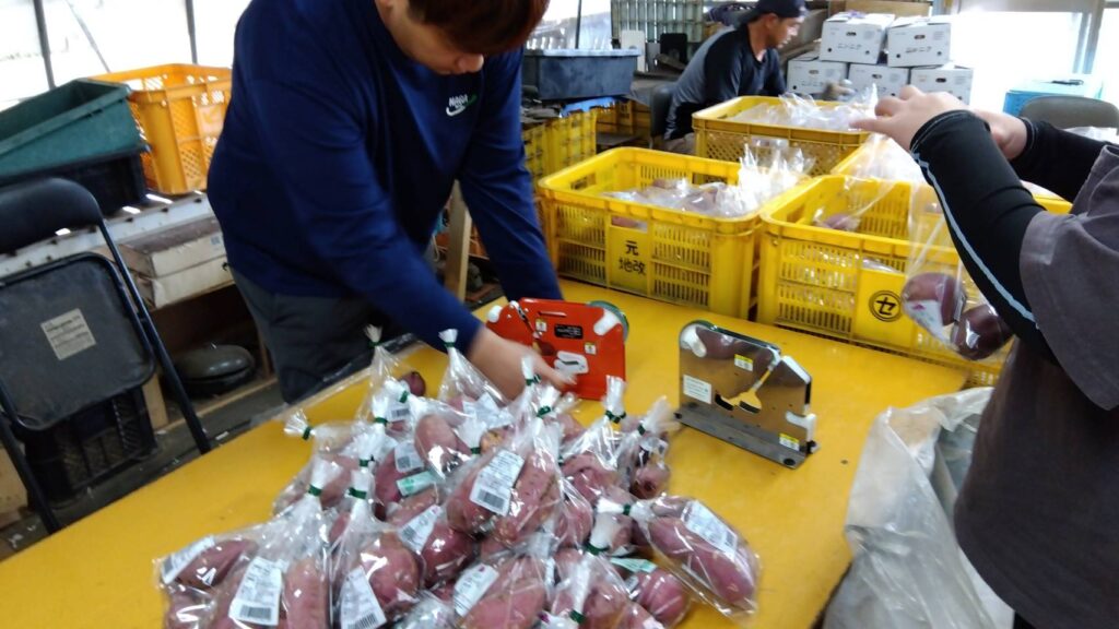 イオンに出荷するためのサツマイモの袋とじ作業です。